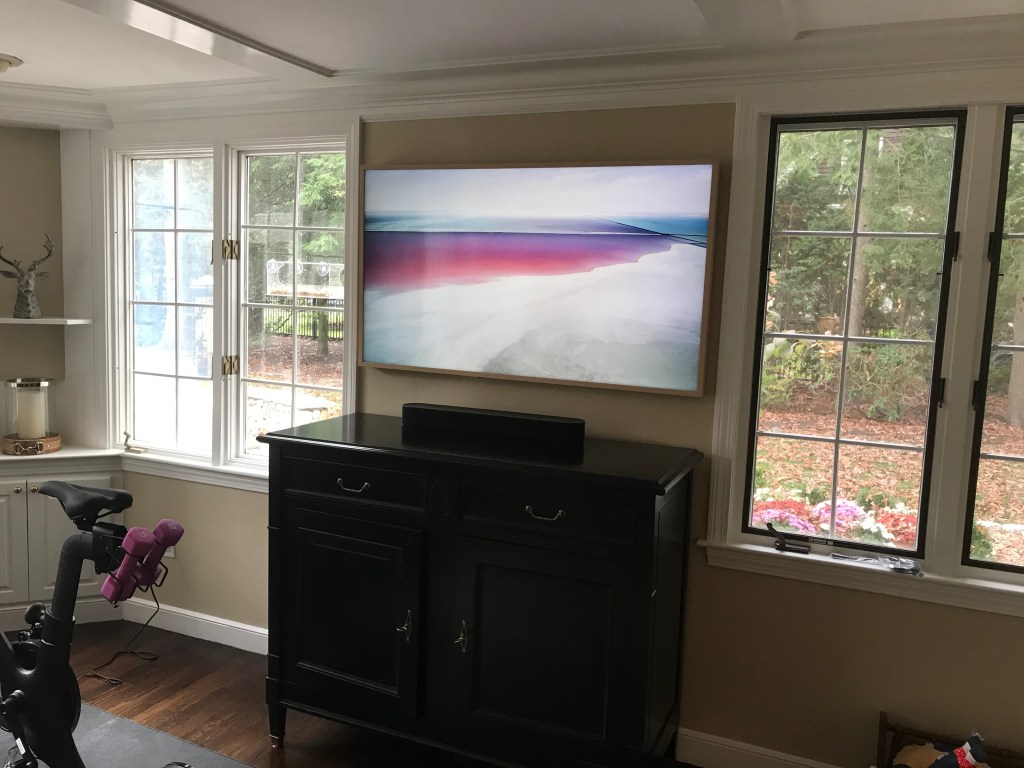 We hired an electrician to help us fully install and mount the TV. The Frame TV sits flush against the wall (can not be tilted btw), because it usually requires drilling a hole behind the frame screen for the wire to go from the back of the frame to down below to the box unit that is the ‘brains’ of the TV. The remote runs on radio frequency, so that box doesn’t have to be visible to use the remote — how nice! You can connect the Frame TV to other speakers, sound bars, etc., as well to create the visual/audio theater that you desire. If you are not that tech savvy you, too, may want to have the help of an electrician, but we have several friends who mounted and installed their Frame TV on their own! (We are still impressed.)